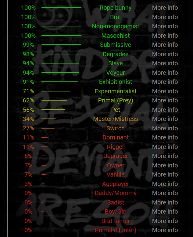 humiliation, degradation, submission, surrender to your feet, spankings, slaps, I love to give good blowjobs and a lot of saliva that you can disperse on my face and my tits, I am a swinger slave and masochist.